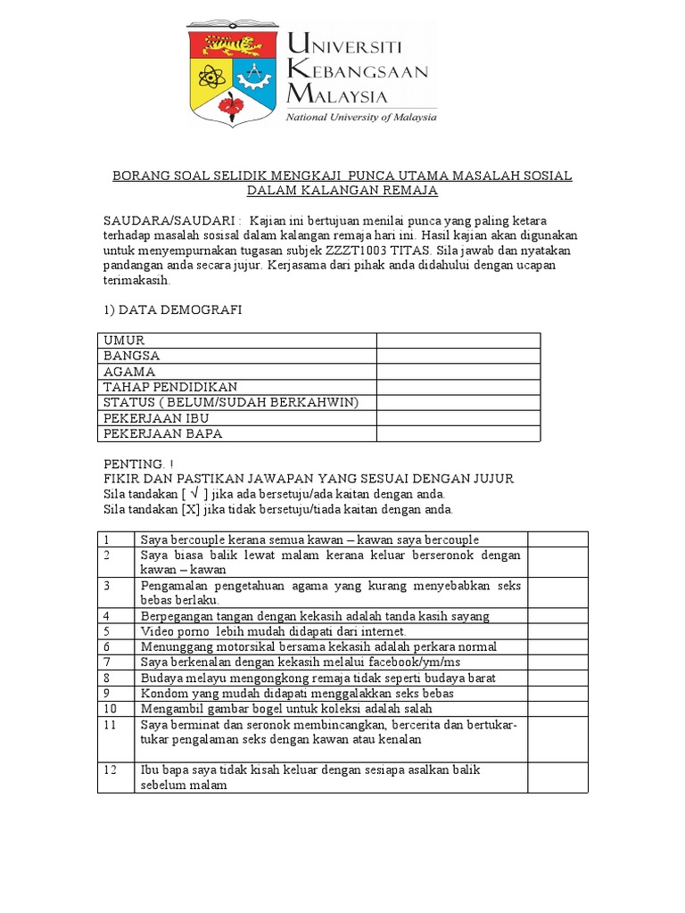 Borang Soal Selidik Mengkaji Punca Utama Masalah Sosial Dalam Kalangan Remaja