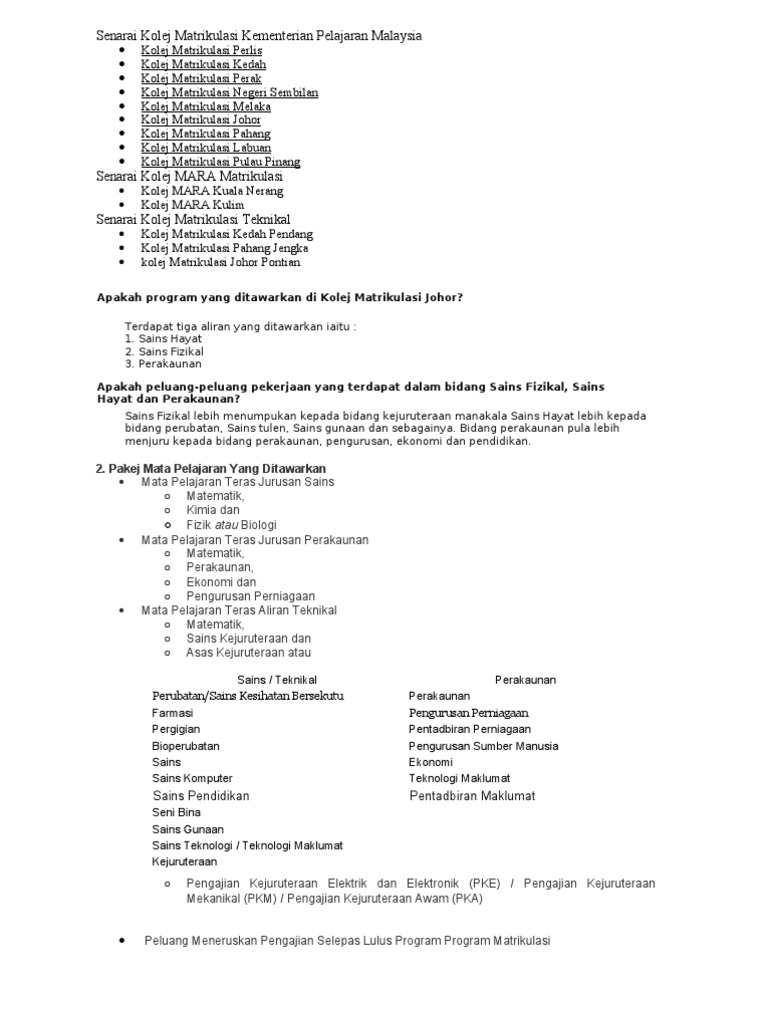 Senarai Kolej Matrikulasi Kementerian Pelajaran Malaysia Apakah Program Yang Ditawarkan Di Kolej Matrikulasi Johor