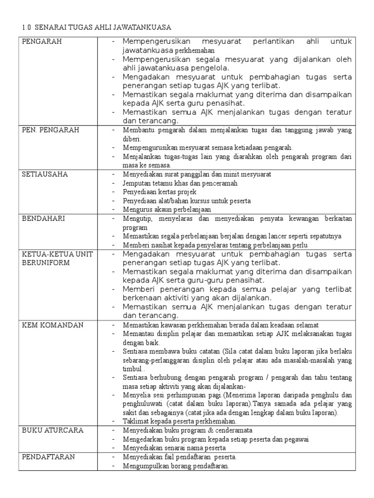 Senarai Bidang Tugas Ahli Jawatankuasa